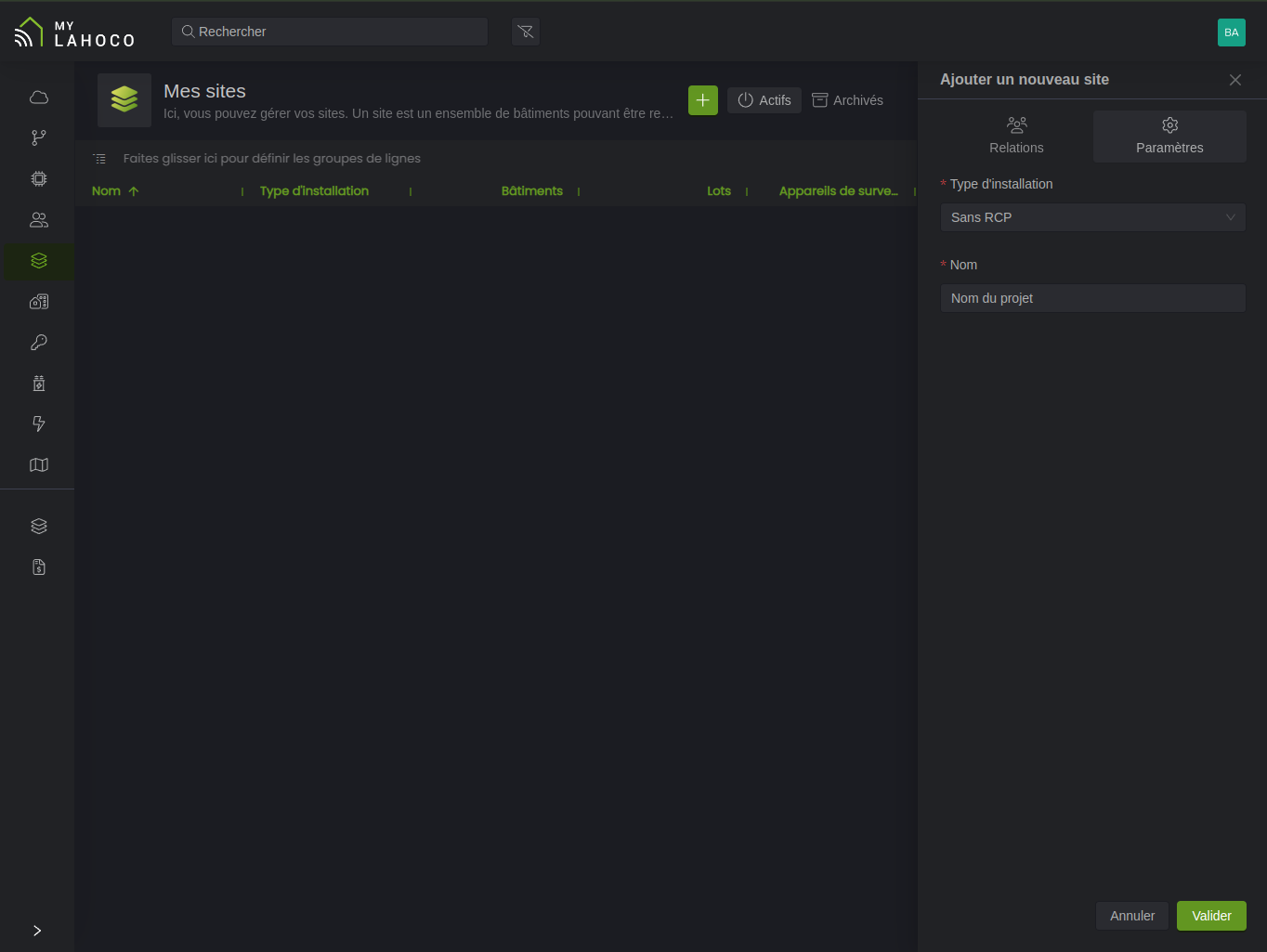 Fahren Sie mit der Aktivierung fort, indem Sie den Namen der Einrichtung und die Adresse des Gebäudes, in dem sich Ihr LAHOCO befindet, ausfüllen. Bei der erweiterten Konfiguration können Sie Ihre eigene Anlage, Gebäude und Lot manuell erstellen.