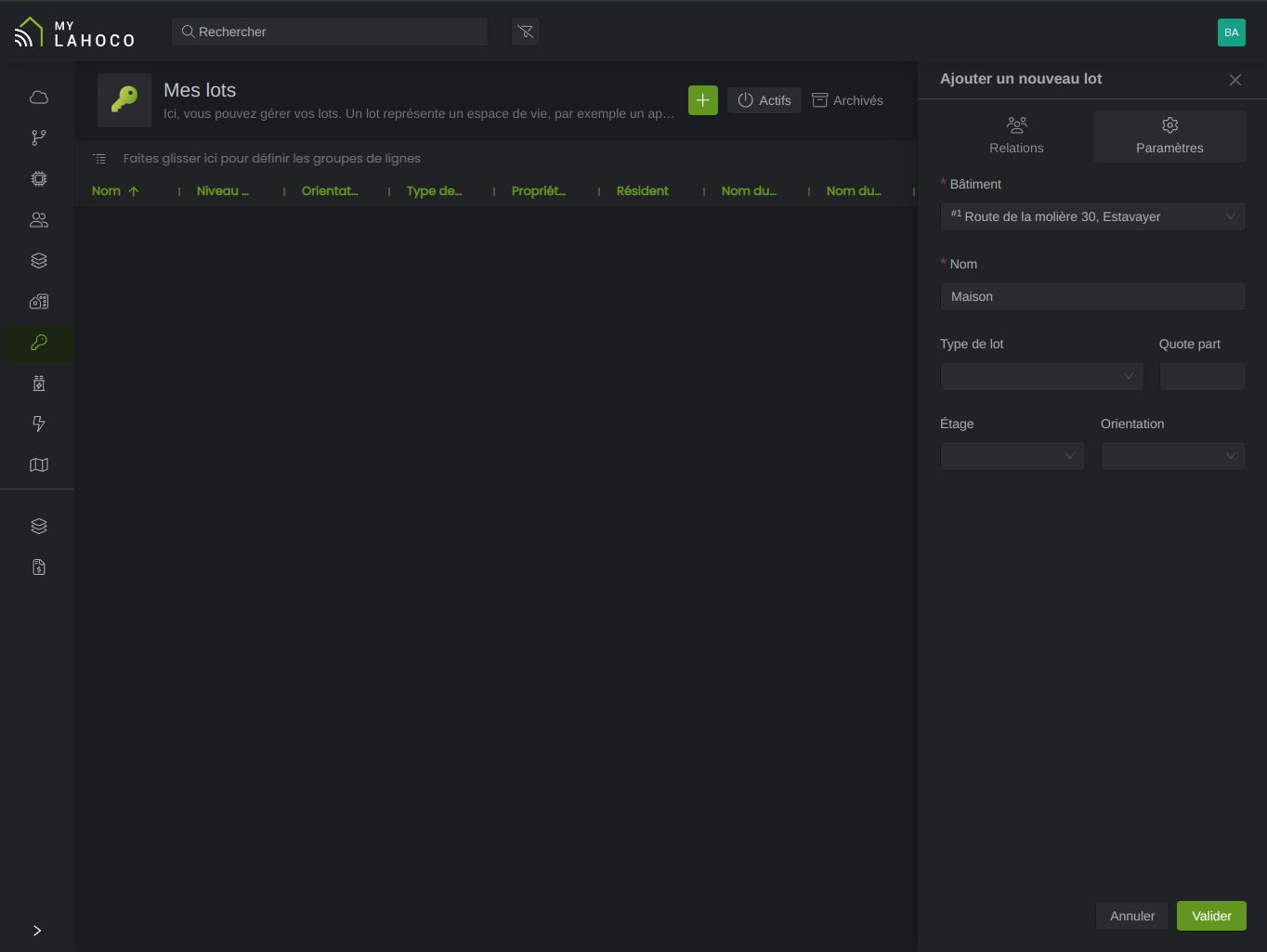 , um ein neues Los zu erstellen. Geben Sie das zuvor erstellte Gebäude und einen Namen an und klicken Sie auf Bestätigen.