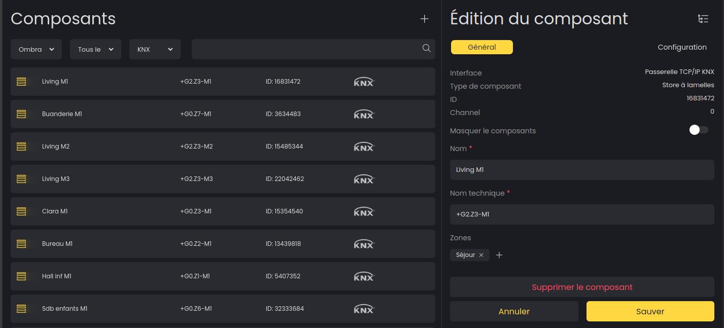 Cliquer sur l'icône “+” située en haut à droite pour ajouter un nouveau composant. Il est alors possible de configurer l’interface, le type de composant et ses paramètres.