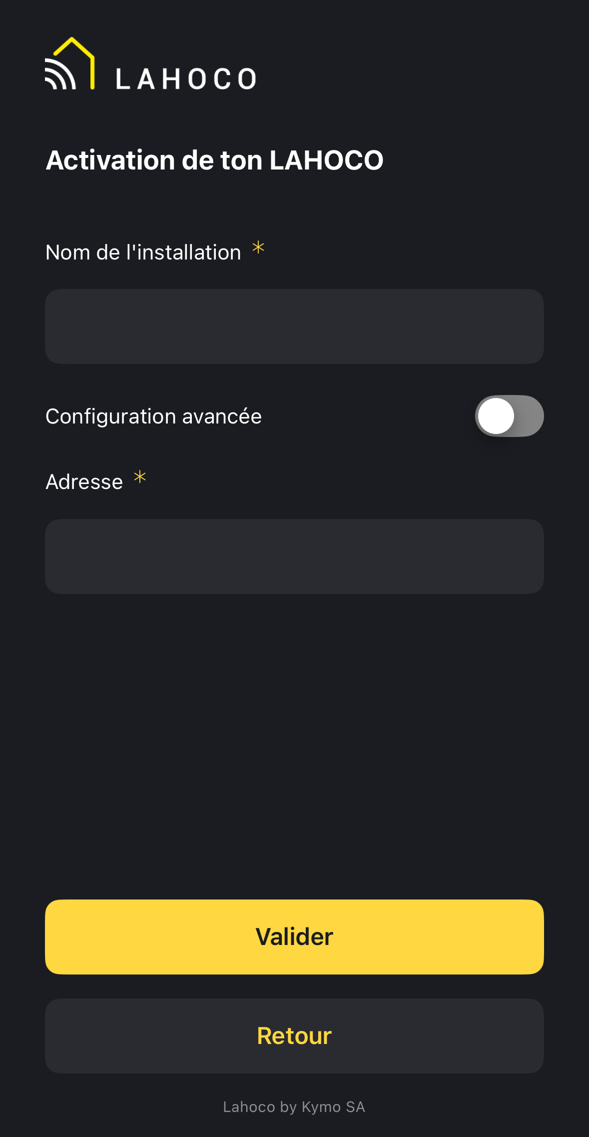Procédez à l’activation en remplissant le Nom de l’installation et l’Adresse du bâtiment où se trouve votre LAHOCO CORE. La configuration avancée permet de créer manuellement votre propre Site, Bâtiment et Lot. Il sera possible de modifier ces informations par la suite via myLAHOCO.